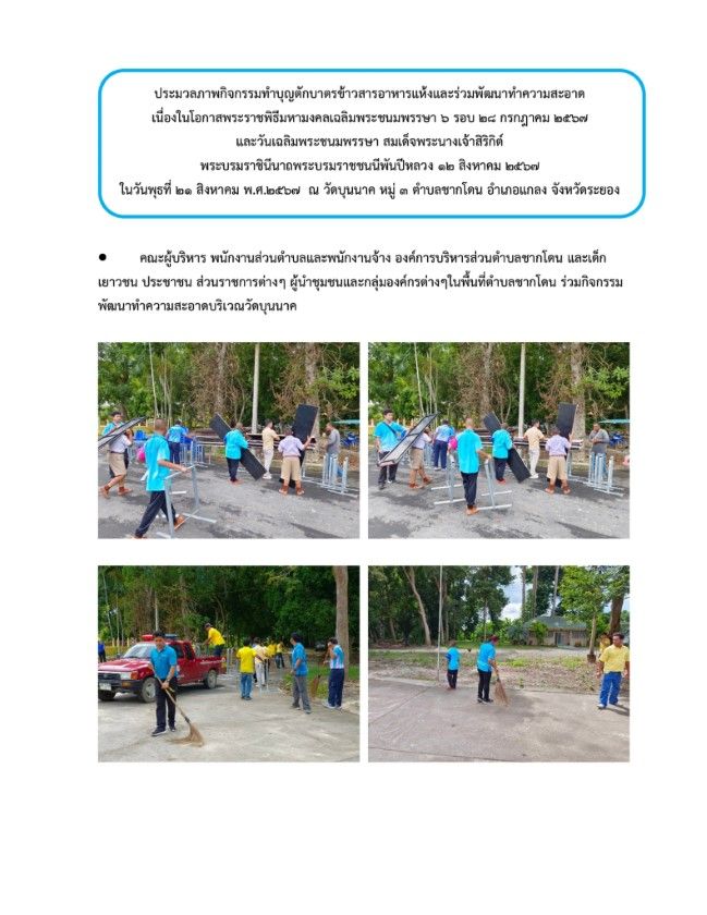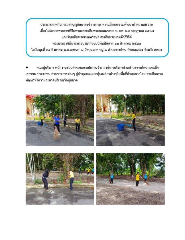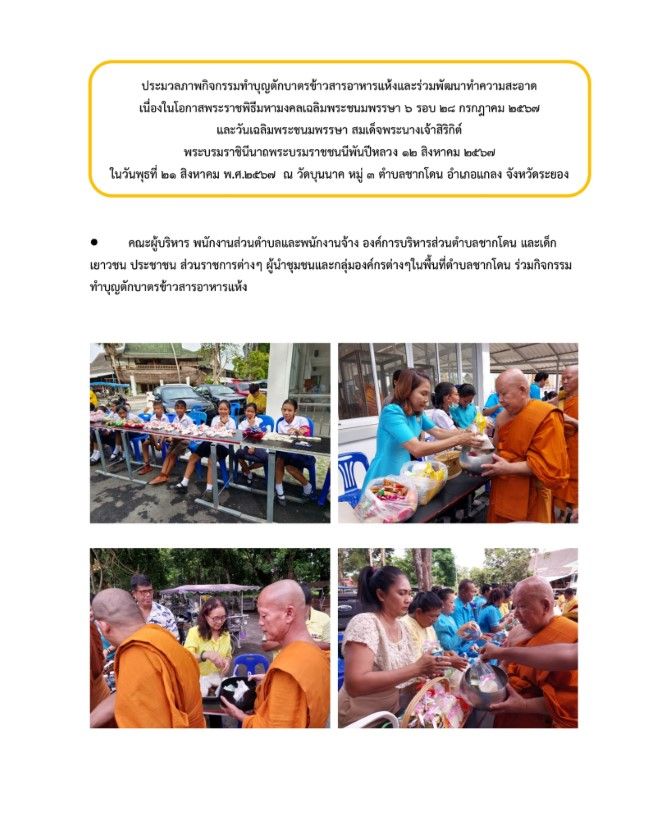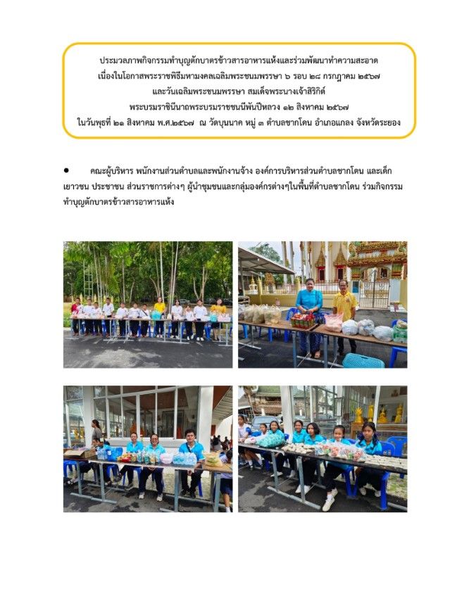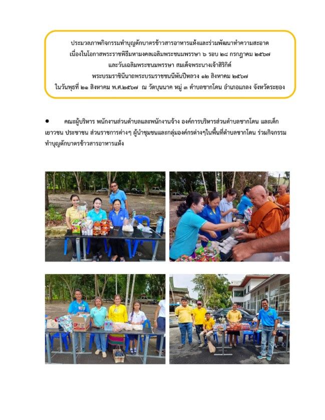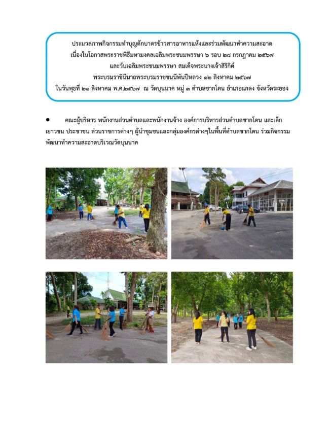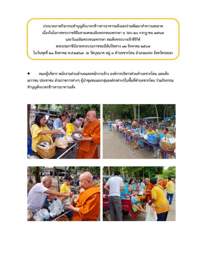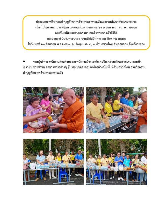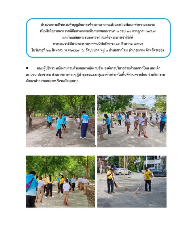 กิจกรรมทำบุญตักบาตรข้าวสารอาหารแห้งและร่วมพัฒนาทำความสะอาด วันที่ 23 สิงหาคม 2567 [ 20:10 น. ] เข้าชม 27 ครั้ง พิมพ์ ภาพกิจกรรม กิจกรรมทำบุญตักบาตรข้าวสารอาหารแห้งและร่วมพัฒนาทำความสะอาด กิจกรรมทำบุญตักบาตรข้าวสารอาหารแห้งและร่วมพัฒนาทำความสะอาด เนื่องในโอกาสพระราชพิธีมหามงคลเฉลิมพระชนมพรรษา 6 รอบ 28 กรกฎาคม 2567 และวันเฉลิมพระชนมพรรษา สมเด็จพระนางเจ้าสิริกิต์ พระบรมราชินีนาถ พระบรมราชชนนีพันปีหลวง 12 สิงหาคม 2567ในวันพุธที่ 21 ส.ค. 2567 คณะผู้บริหาร พนักงานส่วนตำบลและพนักงานจ้าง องค์การบริหารส่วนตำบลชากโดน และเด็ก เยาวชน ประชาชน ส่วนราชการต่างๆ ผู้นำชุมชนและกลุ่มองค์กรต่างๆในพื้นที่ตำบลชากโดน ร่วมพิธีเจริญพระพุทธมนต์,ตักบาตรข้าวสารอาหารแห้งและร่วมพัฒนาทำความสะอาดเพื่อถวายเป็นพระราชกุศลแด่พระบาทสมเด็จพระเจ้าอยู่หัว เนื่องในโอกาสพระราชพิธีมหามงคลเฉลิมพระชนมพรรษา 6 รอบ 28 กรกฎาคม 2567 และวันเฉลิมพระชนมพรรษา สมเด็จพระนางเจ้าสิริกิต์ พระบรมราชินีนาถ พระบรมราชชนนีพันปีหลวง 12 สิงหาคม 2567 อัลบั้มภาพ